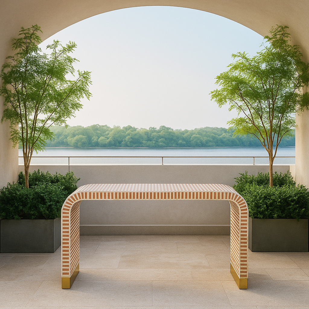 White Bone Inlay Curved Console Table in Almond Finish – Handcrafted Designer Furniture